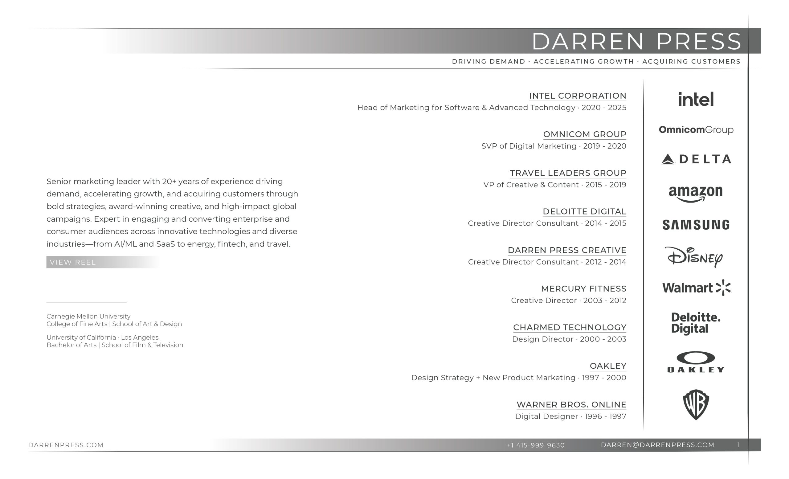 Before Intel, Darren served as SVP of Digital Marketing at Omnicom, leading high-impact programs for Fortune 100 brands including Altria, ExxonMobil, and CVS Health. He was also a Creative Director Consultant at Deloitte Digital, partnering with Microsoft, Nestlé, and HSBC to drive digital transformation, and VP of Creative & Content at Travel Leaders Group, where he led global marketing for Royal Caribbean, Delta Air Lines, and Universal Orlando.